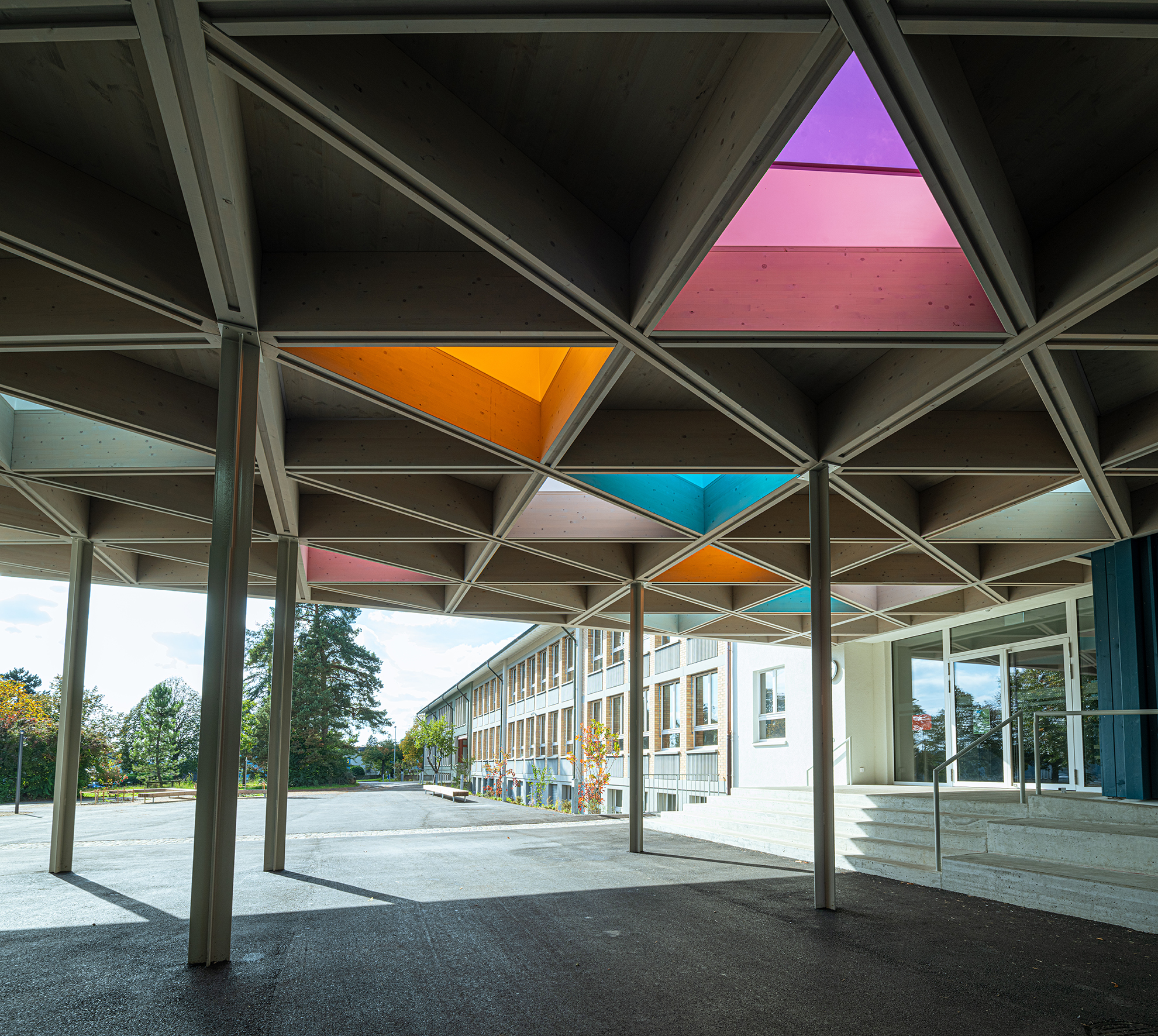 Zwischen dem 1954 erstellten Altbau und dem 2025 fertiggestellten Neubau verbindet ein Tageslicht-Pavillon mehr als nur Räume – er verbindet Zeiten. Unter ihm leuchten 20 farbige Dreiecke in Orange, Hellblau, Pink, Lila und Grün wie Edelsteine in einer Dachlandschaft. Täglich durchqueren Schüler diese Passage. Doch sie gehen nicht einfach – sie erleben. Unter einem Regenbogen aus Glas wandern sie von gestern nach morgen. Ein stiller Erlebnispark aus Tageslicht und Farbe.
