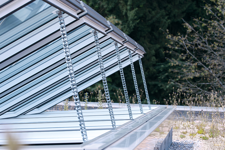 En cas d’incendie, des clapets simples et doubles permettent à la chaleur et aux fumées toxiques de s’échapper et préservent l’accessibilité des issues de secours. Un automatisme 24 V indépendant contrôle les moteurs de broche et de chaîne ou les entraînements pneumatiques. Dans le cadre de la norme EN 12101-2, des solutions individuelles certifiées sont également possibles.